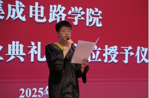 2021级本科生樊明杰代表全体毕业生发言。他深情地分享了在校学习生活的点点滴滴,从初入校园的懵懂,到逐渐在专业领域中探索前行;从与同学们的并肩奋斗,到老师们的悉心指导。“感谢母校为我们提供了如此优质的学习平台,感谢每一位老师的辛勤付出,也感谢一路相伴的同学们”,他的话语情真意切,引发了台下毕业生们的强烈共鸣。最后他表示将勇担时代使命、投身中国芯自立自强的伟大征程中去。