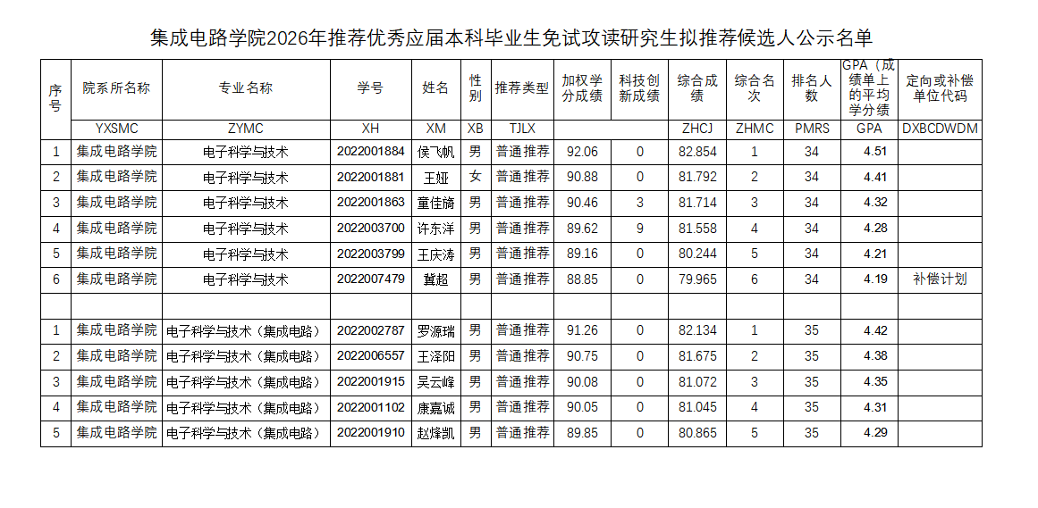 附:《2026年推荐优秀应届本科毕业生免试攻读研究生拟推荐候选人公示名单》