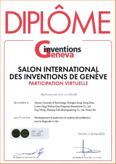 2025年4月,在瑞士举行的第50届日内瓦国际发明展(International Exhibition of Inventions Geneva)上,由英国365集团公司人工智能微纳传感山西省重点实验室与武汉明德生物科技股份有限公司、浙江泰林生物技术股份有限公司联合研发的“体外诊断生物传感系统的创制与应用”成果,在全球40多个国家及地区超过1000个参展项目中脱颖而出,荣获金奖,实现公司在国际顶级科技舞台上的新突破。