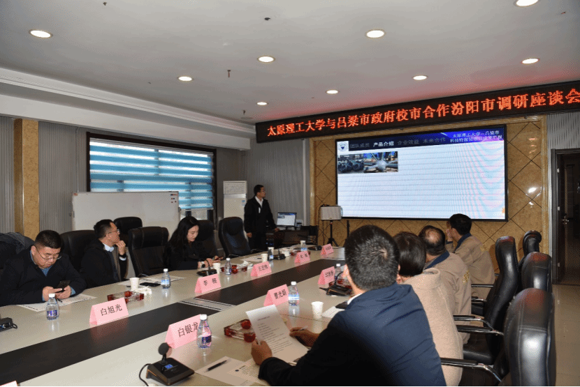沈兴全书记一行观看了企业宣传片,公司教师张海涛向沈兴全书记和公司相关部门领导、汾阳市相关领导汇报了与企业合作开发的空心焊接球自动焊接系统项目情况。