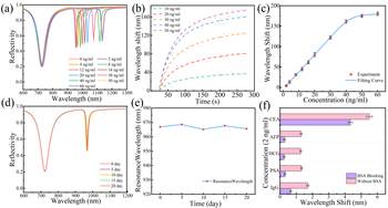 在这项研究中,研究人员创新性地开发了一种基于光子-等离子体耦合增强的法诺共振生物传感平台。该传感器由聚甲基丙烯酸甲酯(PMMA)微孔阵列波导、MY-131-MC(MY)介质层和银基等离子体层组成。这种结构设计能够精确调节局部光子场与微孔膜之间的空间耦合,使探测光的电磁场与微孔阵列波导有效重叠。此外,三维微结构增强了光物质相互作用的强度。实验结果表明,该传感器在折射率(RI)检测方面实现了 56.24 μm/RIU 的超高灵敏度,比传统的 Fano 型传感器(4.9 μm/RIU)提高了 11.4 倍。品质因数 (FOM) 提高到 2,998.94 RIU-¹,比传统的 SPR 传感器高出两个数量级。该平台被用于检测肿瘤生物标记物癌胚抗原(CEA),测量灵敏度为 4.03 nm/(ng/ml),检测限(LOD)为 81.8 pg/ml。此外,该方法还具有极佳的选择性、重复性和稳定性。这种简单而经济的方法为开发生物传感应用中的高性能 SPR 传感器提供了一种新策略。