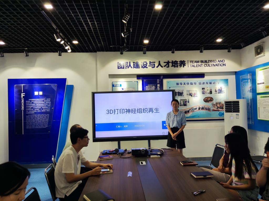 本次学术报告汇报人为成荣博士,汇报的内容是3D打印神经组织再生。成荣博士首先介绍了神经系统在发生损伤后自我修复与重建的条件,中枢神经系统受损后没有再生能力,神经细胞移植是临床修复受损神经较好的方法。接着结合近期高水平的论文,介绍了3D打印合成复杂结构的支架的方法,能够将多种细胞精准的打印到支架中以创造有效的神经细胞仿生环境。最后,介绍了相关领域的研究成果,阐述了3D打印神经组织工程再生的原理与应用价值。参会的各位老师员工就学术报告相关内容进行了热烈的讨论。