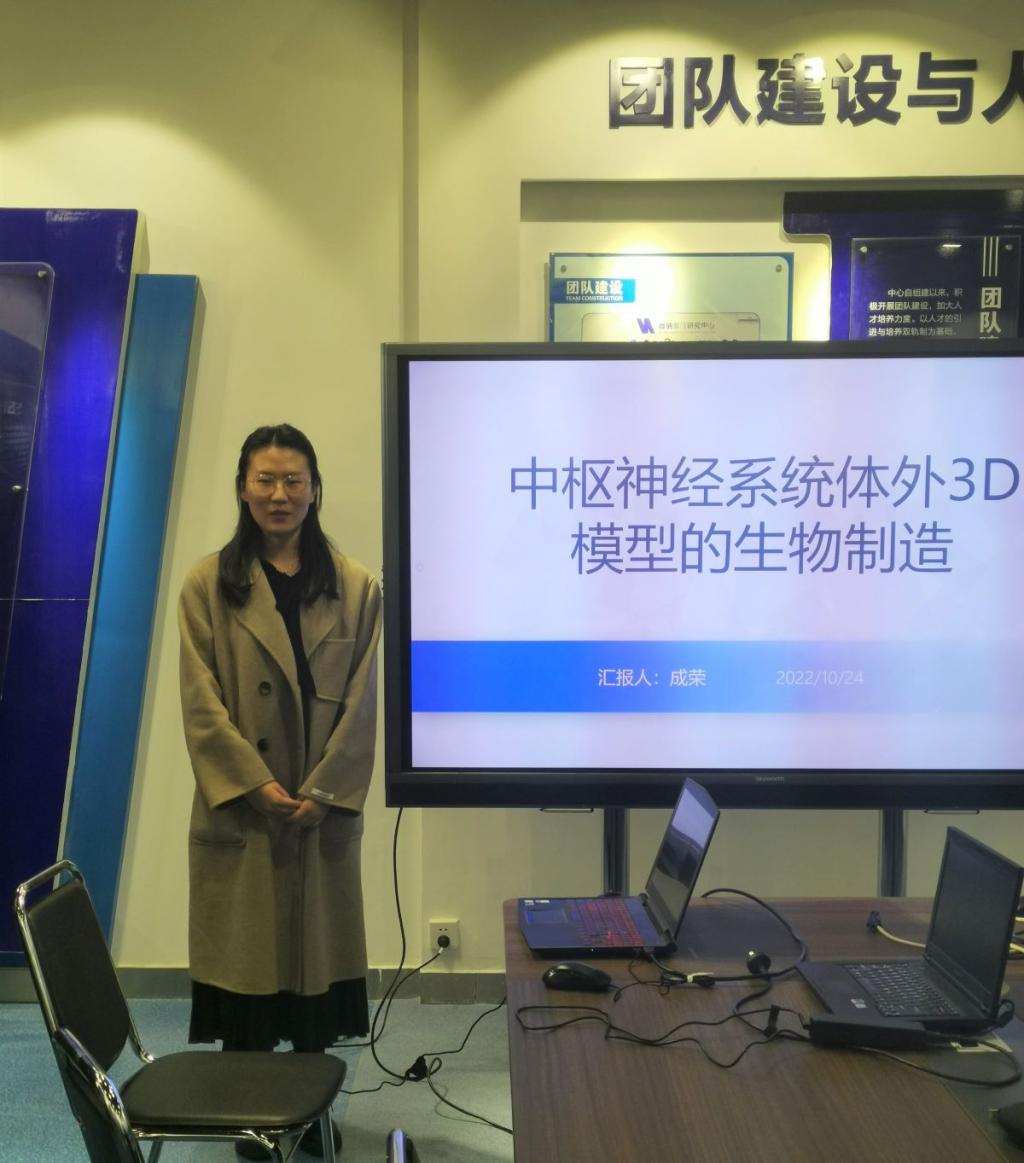 本次学术报告汇报人为成荣博士,汇报的内容是中枢神经系统体外3D模型的生物制造。成荣博士首先介绍了动物模型及体外2D细胞培养用于模拟神经退行性病变进程时的不足之处,提出了3D培养能够重建体内微环境,是较为可行的解决方案。并讨论了体外3D模型在中枢神经系统(CNS)疾病中的挑战,关注打印技术的应用在3D微环境生成上的位置控制,以及生物制造技术需要塑造具有细胞成分代表大脑生化和生物物理参数微环境。通过介绍相关领域的研究成果,帮助大家更好的了解了基于3D打印神经组织工程体外模型制造的原理与应用价值。参会的各位老师员工就学术报告相关内容进行了热烈的讨论。