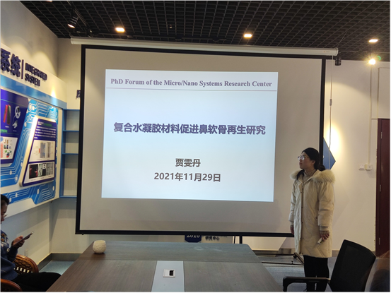本次学术报告汇报人为贾雯丹博士,汇报的内容是基于3D打印的复合水凝胶材料促进鼻软骨再生研究。贾雯丹博士针对近期实验中遇到的一些问题,结合近两年相关高水平的论文,对问题进行了分析并提出了解决方案。随后介绍了其近期进行的工作,即复合水凝胶材料的表征及细胞实验,并介绍了3D打印细胞增值及免疫荧光染色实验等未来的实验规划。参会的各位老师员工就学术报告相关内容进行了热烈的讨论。