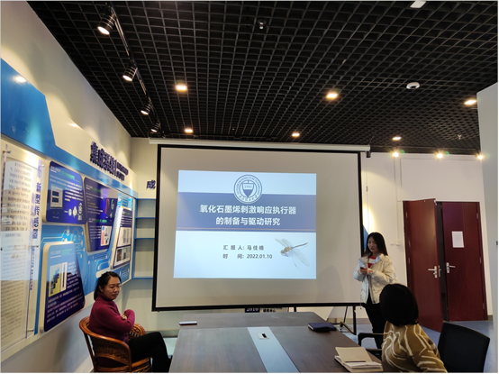 本次学术报告汇报人为马佳楠老师,汇报的内容是氧化石墨烯刺激响应执行器的制备与驱动研究。马佳楠老师介绍了基于氧化石墨烯刺激响应执行器的制备方法、驱动原理以及发展现状,并针对目前存在的问题,提出了材料互补集成、执行器集群、湿度辅助机械应力诱导褶皱、异质愈合等策略,实现了具有双重响应、复杂形变、单一组分以及多功能集成的氧化石墨烯执行器的制备和应用。最后聚焦二维柔性机器人的前沿应用,对未来的工作进行了展望,希望下一步继续探索基于石墨烯的执行器、传感器、储能器件和信号传输部件等新型智能器件,实现器件柔性集成、原位装配和仿生共形。参会的各位老师员工就学术报道相关内容进行了热烈的讨论。